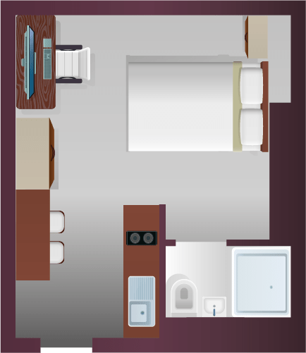 Who wouldn’t want to choose our Platinum Studio option? You’ll have your own double bed, en-suite bathroom, a 32” Smart TV, tons of storage space, fully-fitted kitchen and living space. The best part is, you can crack on with studying at your desk with our fast Wi-Fi and you can enjoy the great views of our courtyard area. Head to our communal lounge to unwind or chill out and watch a film in our cinema room. Fancy a workout? We even have a gym on-site so you can keep fit.
