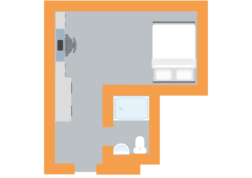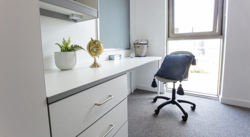 Our large en suite is perfect for those who want a little extra, measuring 16.5m² with a ¾ bed and a wardrobe for all your bits and bobs. Sink into your comfy bed after a long day of studying at your very own desk and chill out in the shared lounge area with a TV afterwards! There’s 100Mbps WiFi throughout the building as well as a shared kitchen area, perfect for rustling up a tasty dish for your mates.