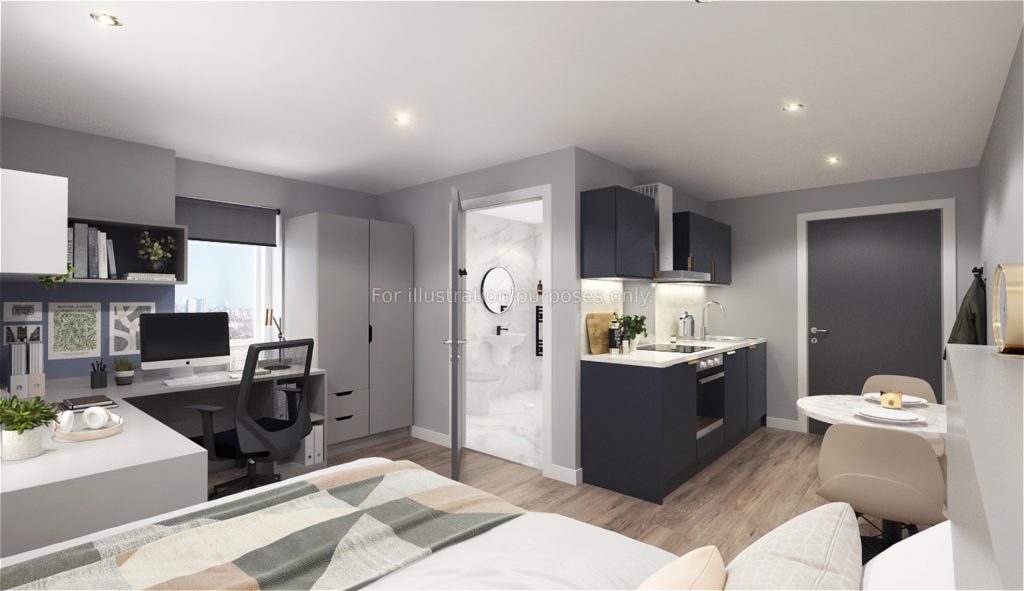 This modern en suite room comes with high quality furnishings and magnificent floor to ceiling windows. Boasting a three-quarter sized bed, a mirror, generous storage and a practical study desk and chair, students will feel right at home in no time. This spacious room measures 14m2 and also has a fully fitted en suite with a large shower and stylish fittings. Enjoy shared kitchen facilities separate to your room and cook yourself something delicious after a long day at university. You will also have access to the beautiful landscaped gardens, cinema room and on-site gym!...